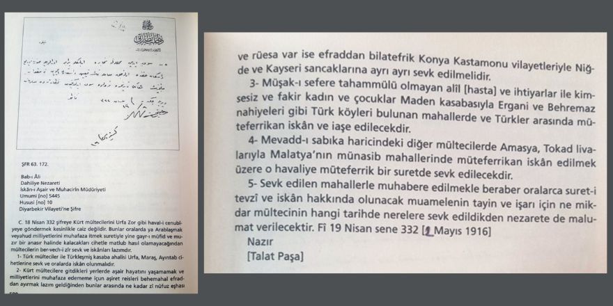 Talat Paşa’nın emirleri, talimatları, şifreli-gizli telgrafları, dönem boyunca devam etmiştir. Özellikle 1916 yılında, vilayetlere, mutasarrıflıklara, diğer devlet yetkililerine gönderdiği çeşitli talimat ve yazışmalarla Kürdlerin mutlaka Batı’da eritilmesini ısrarla belirtmiştir. Sadece BAO’da (Başbakanlık Osmanlı Arşivlerinde), yüzlerce bu tip talimat ve telgrafın listesini “Birinci Dünya Savaşı Yıllarında 1916 KÜRD TEHCİRİ ve İttihat-Terakki’nin Politikaları” kitabımın sonuna ekledim.
