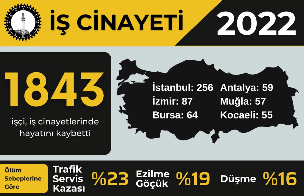 İşçi Sağlığı ve İş Güvenliği Meclisi’nin (İSİG Meclisi), 2022’deki iş cinayetleri bilançosuna göre bu yılda en az 1843 işçi çalışırken hayatını kaybetti.