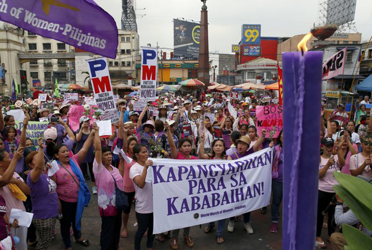 Filipinler’de pembe ve mor tişörtlü yüzlerce kadın, başkent Manila’daki Plaza Miranda’da toplandı.