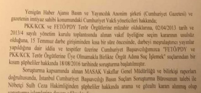 Türkiye'nin en eski ulusal gazetesi olan Cumhuriyet'in yöneticileri ve yazarlarına yönelik olarak 31.10.2016 da sabah saatlerinde operasyon başlatıldı