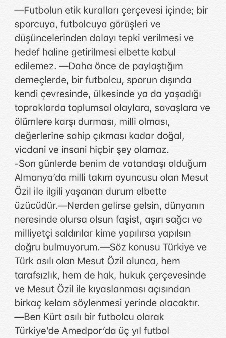 Deniz Naki'nin Mesut Özil'e hitaben "Seni yerli ve milli görenler, beni neden terörist gördüler?" notuyla paylaştığı açıklama şöyle: