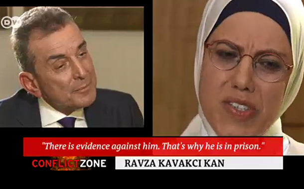 İnsan Haklarından Sorumlu AKP Genel Başkan Yardımcısı Ravza Kavakçı, Deutsche Welle’nin Conflict Zone programında Kan Friedman’ın sorularını yanıtlamaya çalıştı. Friedman’ın Deniz Yücel ile ilgili sorduğu sorulara ezber yanıtlar vermeye çalışan Kavakçı, “Deniz Yücel hiçbir suçlama olmadan nasıl bir yıldır cezaevinde tutuluyor” sorusuna “Türkiye bir hukuk devletidir” yanıtını verdi.