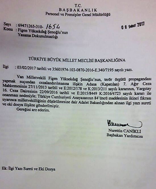 HDP Eş Genel Başkanı ve Van Milletvekili Figen Yüksekdağ’ın milletvekili olmadan önce hakkında açılan bir davadan aldığı ceza nedeniyle milletvekilliği düşürüldü. Başbakan Yardımcısı Nurettin Canikli imzalı Başbakanlık tezkeresi olarak Meclis Genel Kurulu’nda okunan kararda “Yüksekdağ’ın Yargıtay’dan kesinleşmiş kararı dolayısıyla milletvekilliği düşürülmüştür” ifadesi kullanıldı.