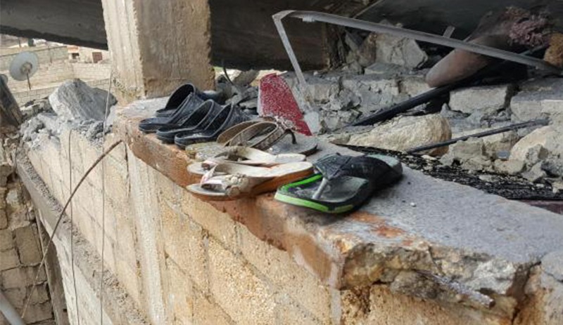 "Küçük bir köy olan Maabatlı'da Taha Mustafa al-Khatr, eşi, iki kızı ve oğlu uyumadan önce ayakkabılarını evlerinin kapısının bıraktı. Orta Doğu'da pek çok aile de aynı şeyi yapar. Bu bir gelenektir ve evin temizliğinin işaretidir. Türk top mermisi onların evini vurduğunda, ucuz plastik terlikler elbette hala oradaydı. Birkaç saat sonra evlerine vardığımda, aynı ayakkabıları buldum. Birkaçı merdivenlere düşmüştü, çoğu ise hala yan yana sıralıydı...Kürt vilayeti Afrin'deki kurtarma görevlileri bile ayakkabılara dokunmadılar...Ancak elbette cesetler gitmişti...19 yaşındaki Safa mucizevi bir şekilde kurtuldu, sadece ellerinden yaralandı. Ancak elbette o artık bir yetim.