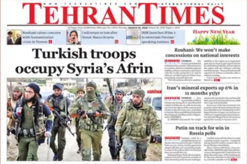 İran'da dini lider Ali Hamaney'e yakınlığıyla bilinen Tehran Times gazetesi, Türkiye'nin Afrin operasyonunu sert bir başlıkla manşetine çekti. Türkiye’nin Afrin’i ele geçirmesiyle ilgili bilgilerin aktarıldığı haberde “Türk askerleri Afrin'i işgal ediyor” başlıklı manşet kullanıldı.