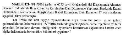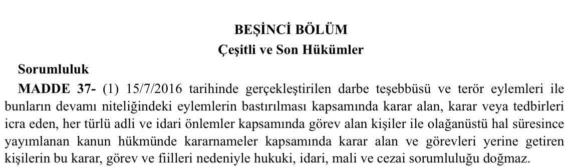 Yayınlanan KHK ile "15 Temmuz darbe girişiminde ve 'bunların devamı niteliğindeki olayların' bastırılması kapsamında görev alan kişilere, görev ve fiilleri nedeniyle hukuki, idari, mali ve cezai sorumluluk doğmaz" ifadeleri dikkat çekti. Bunların devamı niteliğindeki olaylar ifadesi, kamuoyunda iç savaş tehtidi barındırdığı ve her türlü muhalif eylemde adam öldürmeye cezai sorumsuzluk getireceği endişesi barındırıyor.