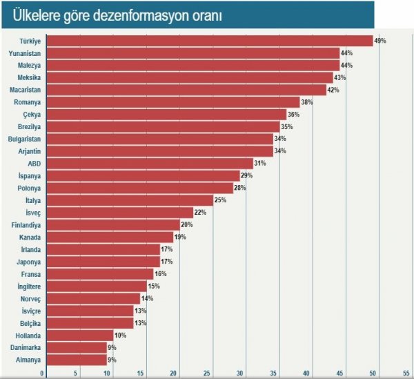 Euronews'in haberine göre Oxford Üniversitesi Reuters Enstitüsü'nün dezenformasyon ve yanıltıcı haber konusunda 37 ülkede yaptığı bir araştırmada Türkiye yüzde 49 ile bu alanda en çok dezenformasyona uğrayan ülke olarak açıklandı. Türkiye'yi Avrupa ülkeleri arasında yüzde 44 ile Yunanistan, yüzde 42 ile Macaristan, yüzde 38 ile Romanya ve yüzde 36 ile Çekya takip ediyor. 'Fake-news' yani sahte haber ifadesinin en yaygın olarak kullanıldığı Amerika Birleşik Devletlerinde bu oran yüzde 31 düzeyinde görünüyor.