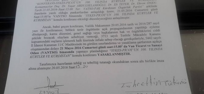 Van Valiliği tarafından alınan yasaklama kararında ‘’…konferansın; bölücü terör örgütünün açık propagandasının yapıldığı eyleme dönüşeceği, kamu düzenini, genel sağlığı veya başkalarının hak ve özgürlüklerini ciddi şekilde bozacak olaylara sebebiyet vereceği,3713 sayılı terörle Mücadele Kanunu kapsamındaki suçların işlenerek halk üzerinde infiale sebep olacağı gerrekçeleriyle,….konferans YASAKLANMIŞTIR’’ denilmektedir.