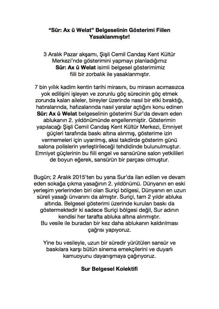 Yarın (3 Aralık) gösterime girmesi planlanan ve Sur'daki yıkımı anlatan 'Sûr: Ax û Welat' belgeselinin gösterimi yasaklandı.Sur Belgesel Kolektifi konuyla ilgili bildiri yayınlayarak ablukanın kalkmasını talep etti.