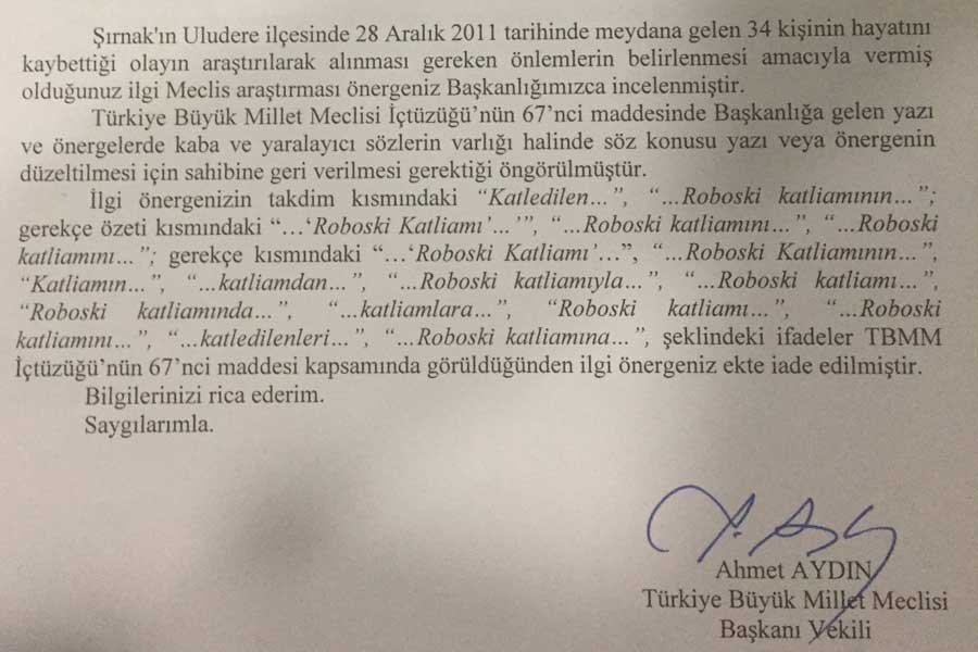 28 Aralık 2011'de çoğunluğu çocuk 34 kişinin katledildiği Roboski Katliamı'nın araştırılması için verilen soru önergesindeki 'Roboski Katlıamı' ifadesini 'kaba ve yaralayıcı' olduğu gerekçesiyle reddetti.
