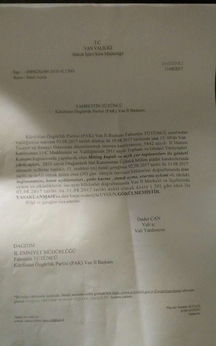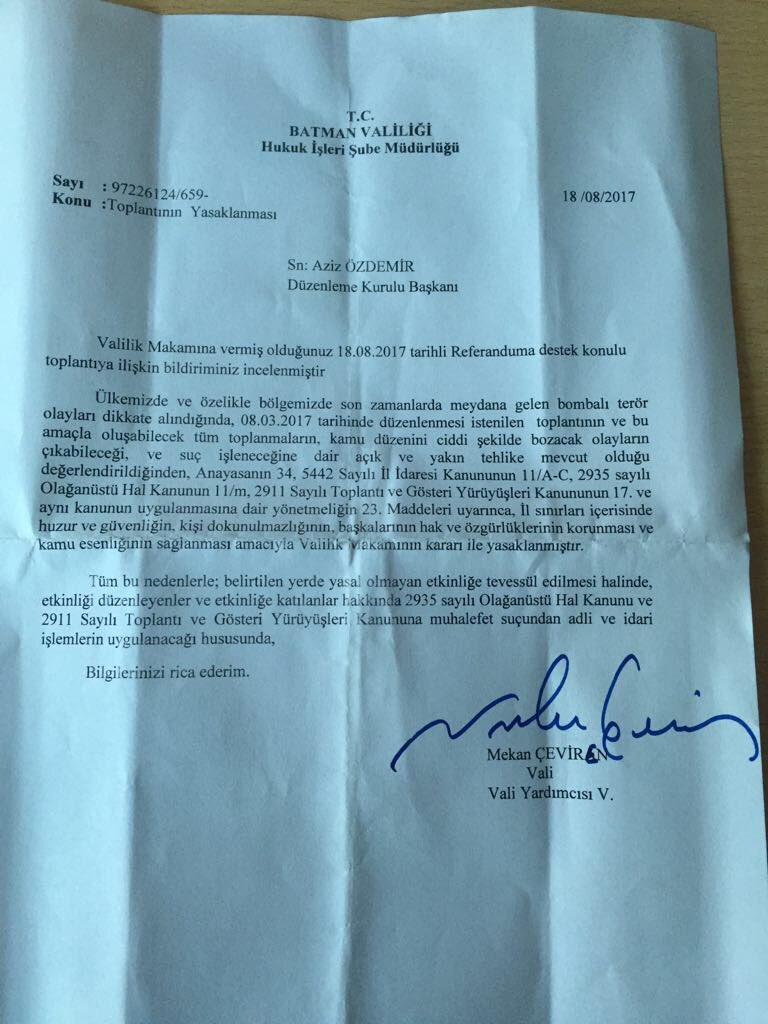 Van ve Batman Valilikleri OHAL'i gerekçe göstererek Bağımsızlık Referandumunu Destekleme İnsiyatifi'nin Destek Konferanslarını yasakladı.