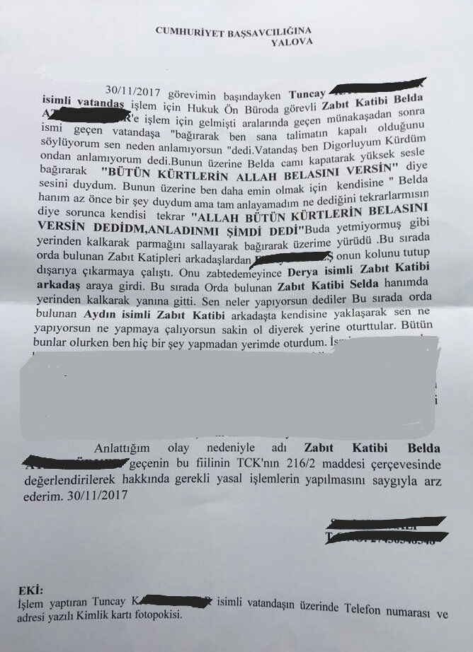 Yalova Adliyesi'nde çalışan Belda A. isimli Zabıt Katibi, işlem yapmak üzere gelen Tuncay K. isimli bir Kürt vatandaşa "ALLAH BÜTÜN KÜRTLERİN BELASINI VERSİN" diye bağırarak nefret suçu işledi. Olaya şahit olan bir başka vatandaş, Belda A. hakkında suç duyurusunda bulundu.