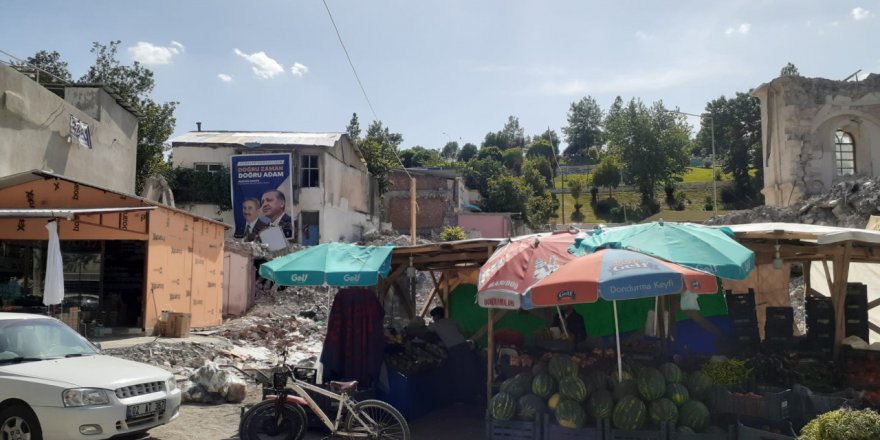 Yıkıntıların arasında seyyar bir manav, satış yapmaya çalışıyor. 6 Şubat depremleriyle Adıyaman’da bazı mahallelerde toplu bina yıkımları yaşandı. Havadan çekilen görüntülerde, bazı bölgelerde büyük enkaz yığınları görülüyordu. Adıyamanlılar da depremin ilk günlerinde depremden etkilenen diğer iller gibi arama kurtarma çalışmalarının vaktinde başlamamasından, barınma, şu, yemek, tuvalet gibi temel ihtiyaçların zamanında karşılanmadığından şikayetçiydi.