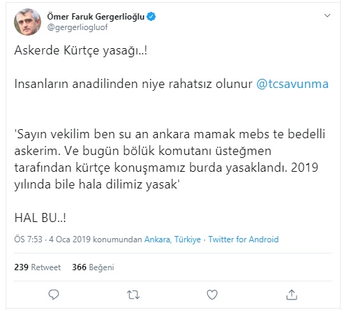 Twitter hesabından yayımlanan mesajda, Mamak’ta asker olduğunu iddia eden kişi, bölük komutanı üsteğmen tarafından Kürtçe konuşmalarının yasaklandığını kaydetti.