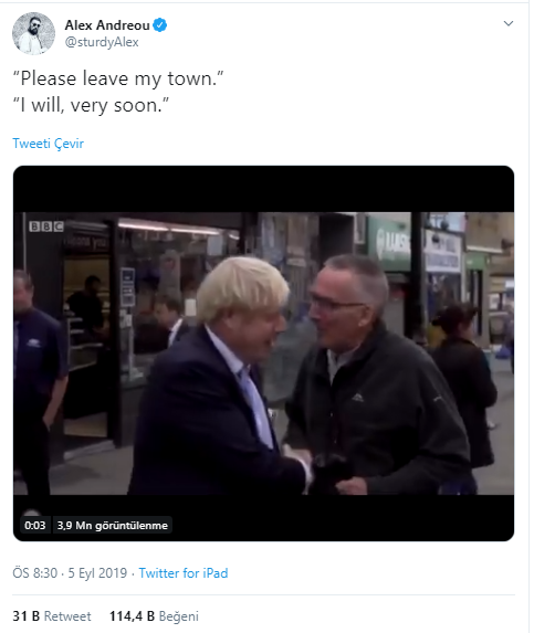 Yorkshire’ı ziyaret eden Başbakan Leeds’e geldiği sırada bir adam yanına yaklaştı ve gülümseyerek elini sıktı. Ve yine büyük bir nezaketle, “Lütfen şehrimi terk et” dedi. Johnson’ın cevabı ise “Çok yakında gideceğim” oldu. Kibarlığı ile dikkat çeken Yorkshire sosyal medyada ‘kahraman’ olarak yorumlandı.