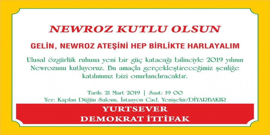 Ulusal özgürlük ruhuna yeni bir güç katacağı bilinciyle 2019 yılının Newrozunu kutluyoruz. Bu amaçla gerçekleştireceğimiz şenliğe katılımınız bizi onurlandıracaktır.