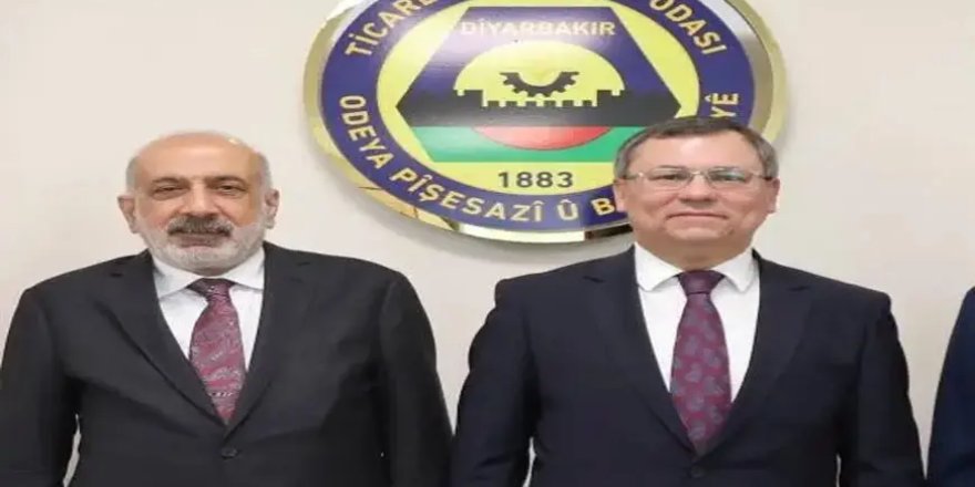 Diyarbakır’da düzenlenen “17. Mezopotamya Tarım, Hayvancılık, Tavukçuluk ve Süt Endüstrisi Fuarı” kapsamında kente gelen Aidar Gaşigullin, DTSO Başkanı Mehmet Kaya’yı ziyaret etti. Ziyaret sonrası paylaşılan fotoğrafta, odanın duvarındaki logoda Kürtçe ifadenin de yer aldığı görüldü.