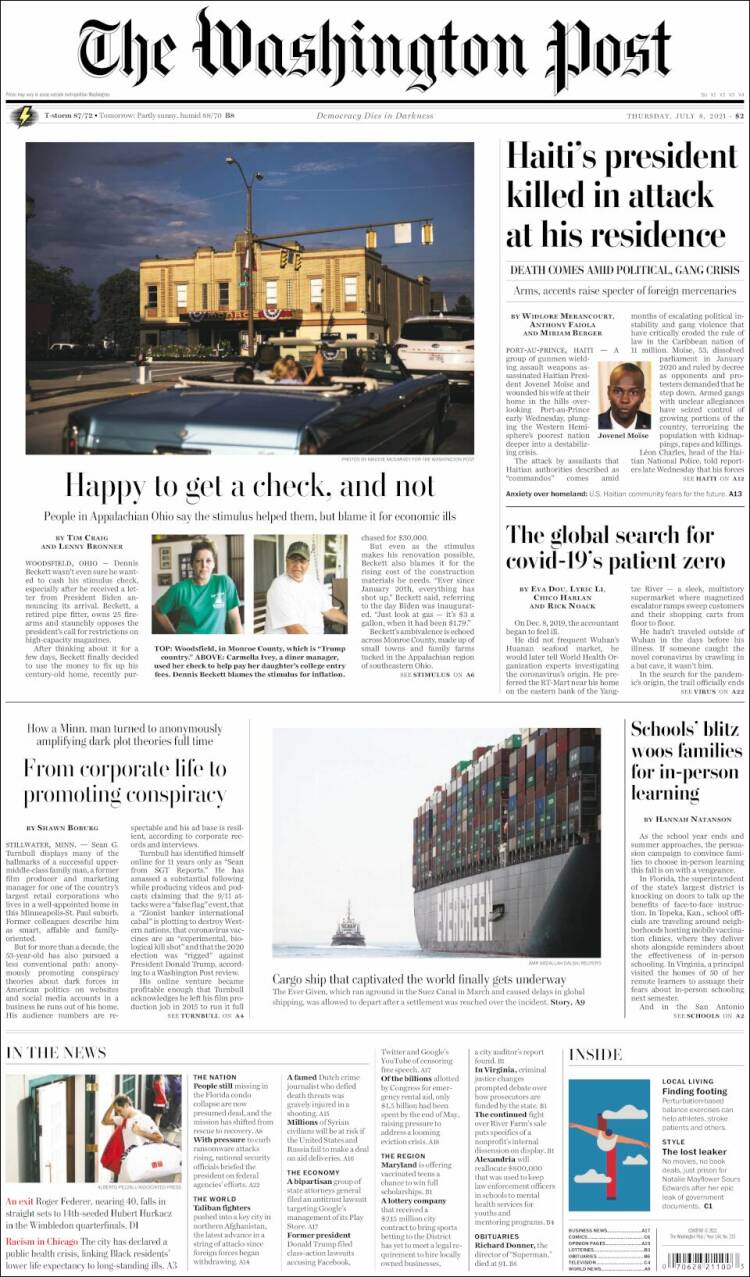 New York Times, 53 yaşındaki Haiti Cumhurbaşkanı Jovenel Moise'in başkent Port-au-Prince'te bulunan evinde kimliği belirsiz kişiler tarafından öldürülmesini manşete taşıdı. Haiti polisi dün suikaste uğrayarak hayatını kaybeden Devlet Başkanı Jovenel Moise'nin katil zanlılarından dördünü öldürdüklerini, ikisini yakaladıklarını duyurdu. Emniyet birimleri amiri yaptığı açıklamada kalan saldırganlarla çatışmanın sürdüğünü belirterek "Ya öldürülecekler ya da yakalanacaklar" ifadesini kullandı.