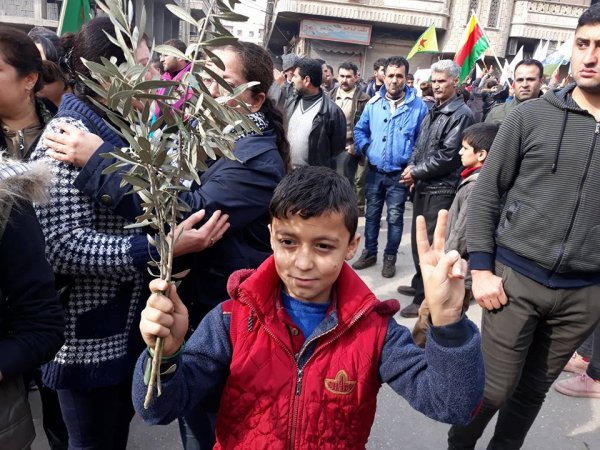 Türkiye ve bağlı grupların 20 Ocak'ta başlattığı saldırıların devam ettiği Efrin kent merkezinde kitlesel bir yürüyüş düzenleniyor.