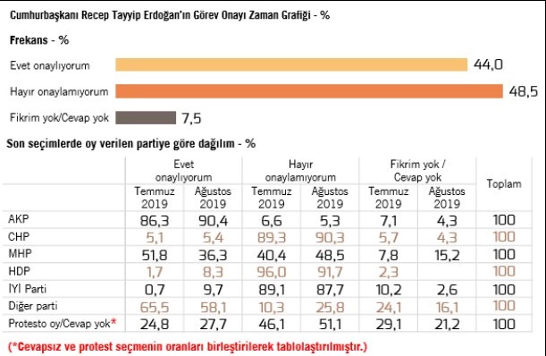 MetroPOLL Araştırma’nın yayınladığı ‘Türkiye’nin Nabzı Ağustos 2019’ başlıklı araştırmaya göre, Cumhurbaşkanı ve AK Parti Genel Başkanı Erdoğan’a 'görev onayı verenler'in oranı yüzde 44’e geriledi.