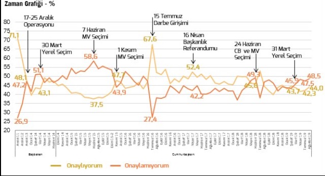 ‘Onaylamıyorum’ diyenlerin oranı da yüzde 48,5’e yükseldi. Geçen yılın aynı döneminde Erdoğan’a görev onayı verenlerin oranı 53.1 olarak ölçülmüştü.