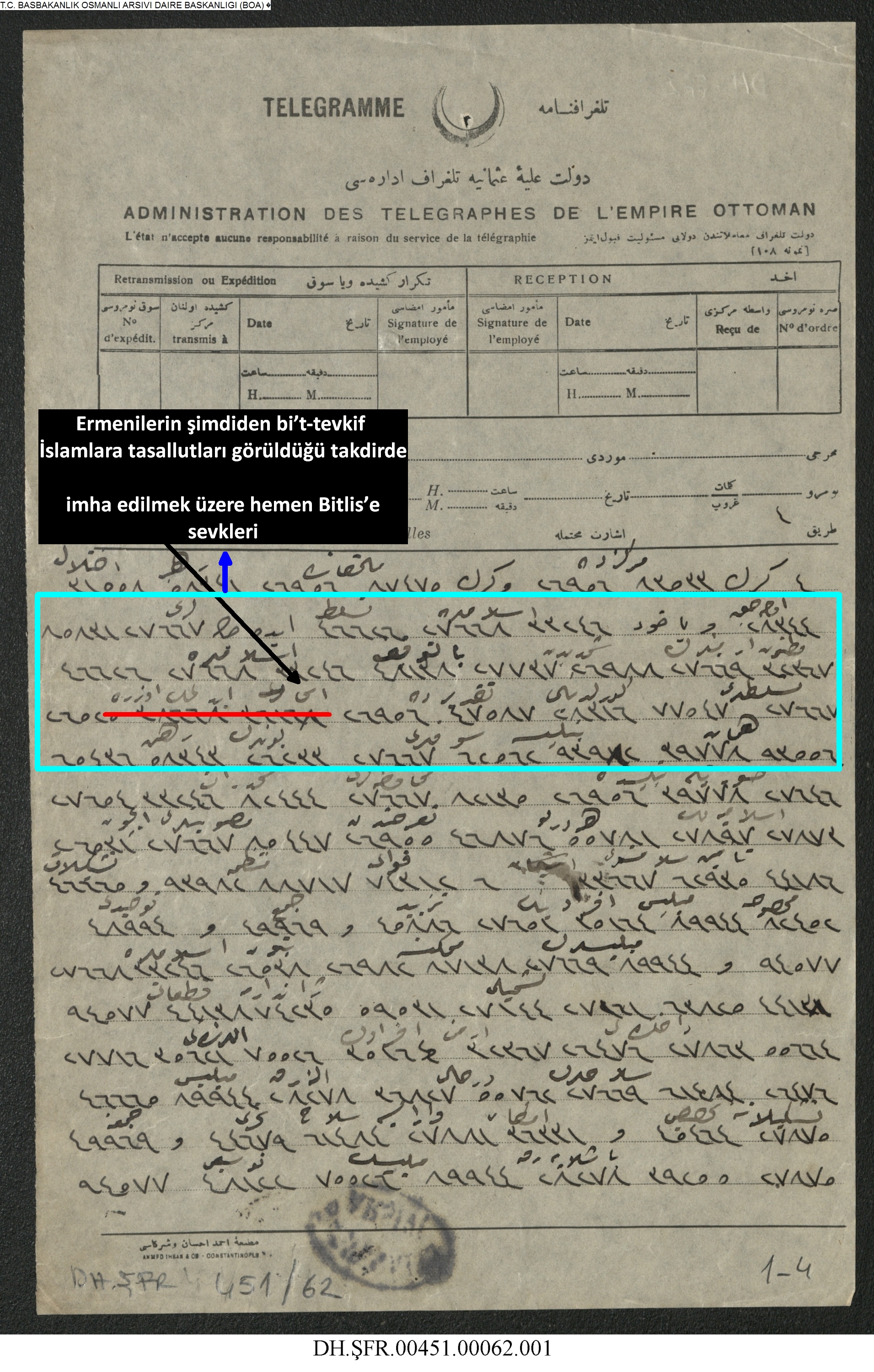Bitlis Valisi için, Ermenilerin imhası vatanını selameti için kaçınılmazdır: İstabul’a yazdığı bir telde, “mevcudiyetleri bünye-i vatan… için daima muzırr görülen bu unsurun [Ermenilerin] kuvva-yı maddiye ve maneviyesiyle imkân mertebesinde imhası selamet-i vataniye icabâtına göredir,” demektedir.