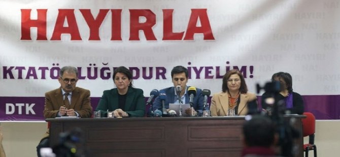 Diyarbakır'da, bir araya gelen DTK, HDK, HDP, DBP, TJA bileşenleri referandum sürecine ilişkin tutumunu açıkladı. “Newroz ruhuyla demokraside direnelim, HAYIR’LA diktatörlüğe dur diyelim!” sloganıyla demokrasi ve barış için seferberlik çağrısı yapılan toplantıda açıklanan deklarasyonda “Bu anayasa, her şeyden önce AKP-MHP anayasasıdır. Tüm siyasi yapıların dahil olduğu bir anayasa olmadığı gibi, ruhu itibariyle etnik, milliyetçi, tekçi, cinsiyetçi ve merkeziyetçi bir anayasadır. Bu anayasanın içinde Kürt halkı da Türkiye toplumu da yoktur. Alevi toplumu, diğer kimlikler ve kültürlerin hakları ve özgürlükleri ile mütedeyyinler ve beklentileri yoktur. Bu anayasada kadınlar yoktur. Bu anayasada emekçiler yoktur. Demokrasi yoktur” denilerek Hayır oyu verilmesi çağrısı yapıldı.