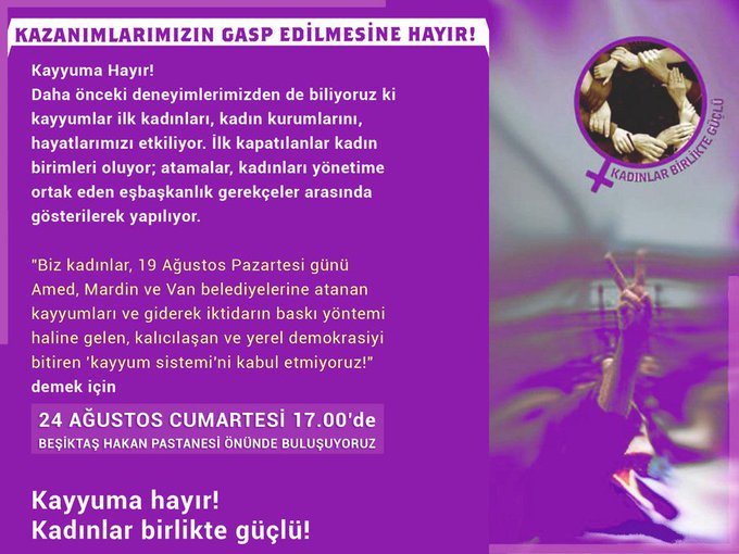 Biz kadınlar, 19 Ağustos Pazartesi günü Amed, Mardin ve Van belediyelerine atanan kayyımları ve giderek iktidarın baskı yöntemi haline gelen, kalıcılaşan ve yerel demokrasiyi bitiren ‘kayyım sistemi’ni kabul etmiyoruz!’ demek için 24 Ağustos Cumartesi 17:00’de Beşiktaş’ta buluşuyoruz” ifadelerini kullandı.