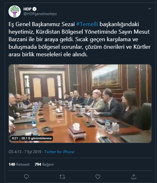 HDP Eş Genel Başkanı Sezai Temelli başkanlığındaki bir heyet, temaslarda bulunmak üzere gittiği Irak Kürt Bölgesinde dün, KDP Lideri Mesut Barzani’yle bir araya geldi. Görüşmede Kürt sorununun çözümü için Barzani’den destek istedi. HDP heyetinin bugün görüştü Irak Kürdistan Bölgesi Başkanı Neçirvan Barzani de çözüm süreci ve barış vurgusu yaptı.