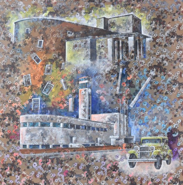 Bu bağlamda, onun eserlerinden biri olan ve Ankara’nın yitip giden mimarisini konu alan tablo, bu hafızanın silinmesine karşı bir direniş niteliğindedir. Çiçek desenli bir fonun üzerinde beliren yapılar, geçmişin anılarını günümüzle buluşturan hayaletimsi bir etki yaratmaktadır. Yıkımı ve dönüşümü anlatan bu resimde, uçuşan pencereler ve dağılan mimari unsurlar, mekânsal kaybın kaotik doğasını yansıtmaktadır.