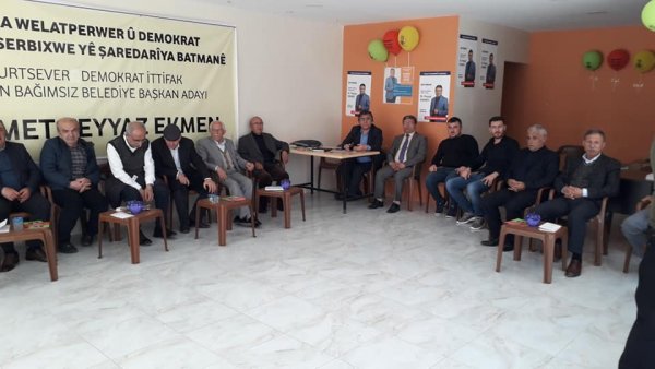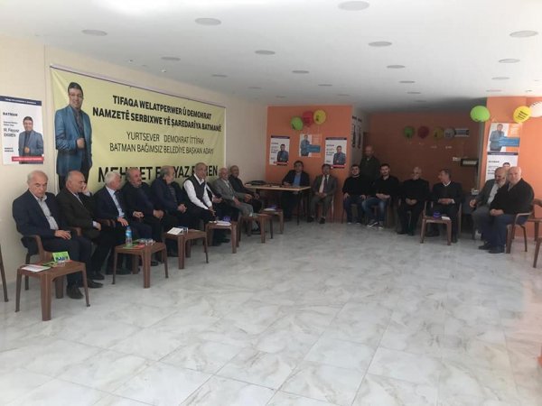 Kürdistan Özgürlük Partisi (PAK) Genel Başkanı Sayın Mustafa Özçelik,11 Mart günü Batman ve Mardin PAK İl Başkanlıkları yönetici ve üyelerinden oluşan bir heyetle, Yurtsever Demokrat İttifak'ın Bağımsız Batman Belediye Başkan Adayı Sayın Mehmet Feyyaz Ekmen'in seçim bürosunu ziyeret etti.