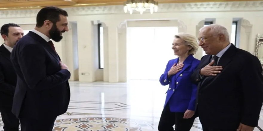 Suriye resmi ajansı SANA'nın haberine göre Şara, başkent Şam'daki Halk Sarayı'nda von der Leyen ve Costa'yı beraberindeki heyetle birlikte kabul etti.