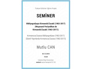 Seminerde 1963-2017 yılları arasında yayımlanmış Kürtçe Süreli Yayınlarda Kırmancanın (Zazaca) yeri üzerinde durulacak, genel bilgilerin yanı sıra bu süreçte içeriğinde ciddi ölçüde Kırmancca yazıların yayımlandığı gazete ve dergiler tek tek incelenecektir. Seminer, slayt sunumu ve Türkçe çeviri (simultane) eşliğinde yapılacaktır. Ayrıca Bîblîyografyaya Kirmanckî /Zazakî) (1963-2018I) [Kırmancca/Zazaca Bibliyografyası (1963-2017) adlı çalışma genel olarak tanıtılacaktır.