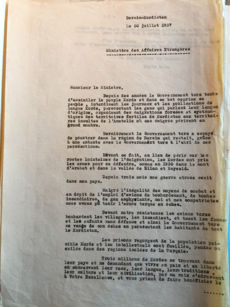 1937’de Seyit Rıza’nın Fransa Dışilişkiler Bakanı’na yazmış olduğu mektubun Fransızca kopyası 1. Sayfa