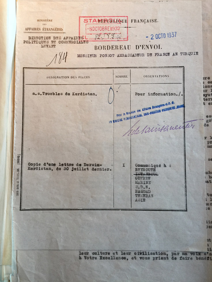 (8) MAE (le ministère des Affaires étrangères ) ,Centre des Archives diplomatiques de Nantes, dossier: Kurdistan 1-XVI (1919-1937), “de Monsieur Ponsot Ambassadeur de France an Turquie (Stamboul) pour le ministre des Afaires Etrangères- a. s . Troubles du Kurdistan / Copie d’une ettre de Dersim-Kurdistan, du 30 juillet dernier (2 october 1937) (Fransa Büyükelçisi (İstanbul) Bay Ponsot’tan Fransa Dışişleri Bakanlığı’na , Kürdistan’daki çalkantılar / Dersim-Kürdistan’dan geçen 30 Temmuz’da gönderilen mektubun kopyası, 2 Ekim 1937.