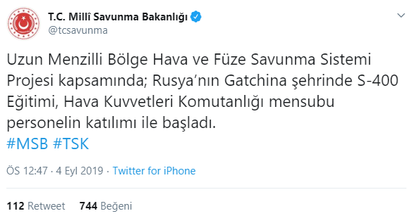 Milli Savunma Bakanlığı'ndan yapılan açıklamada, "Uzun Menzilli Bölge Hava ve Füze Savunma Sistemi Projesi kapsamında Rusya'da, S-400 eğitimi Hava Kuvvetleri personelinin katılımıyla başladı" ifadelerine yer verildi.