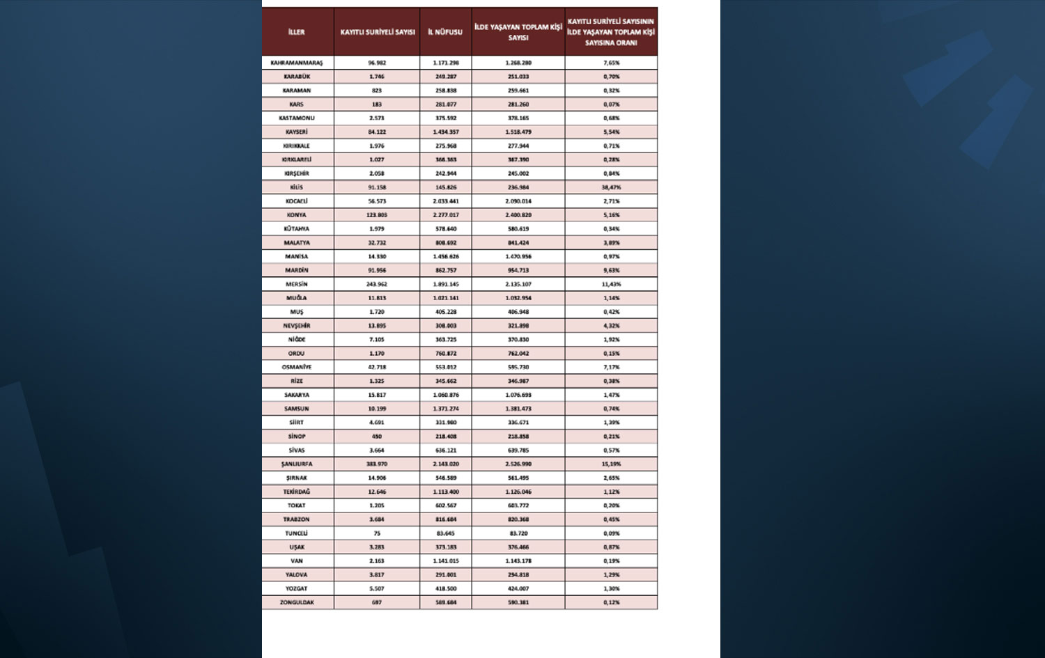 Buna göre Türkiye’de bulunan Suriyelilerin Suriyelilerin %98,7’si şehirlerde yaşıyor.