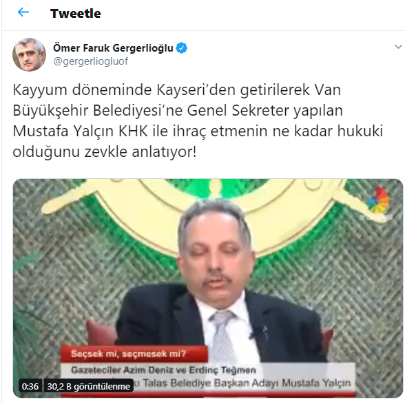 Yalçın'ın konuşmasını kişisel Twitter hesabından paylaşan HDP Kocaeli Milletvekili Ömer Faruk Gergerlioğlu, "Kayyım döneminde Kayseri’den getirilerek Van Büyükşehir Belediyesi’ne Genel Sekreter yapılan Mustafa Yalçın KHK ile ihraç etmenin ne kadar hukuki olduğunu zevkle anlatıyor!" tepkisi gösterdi.