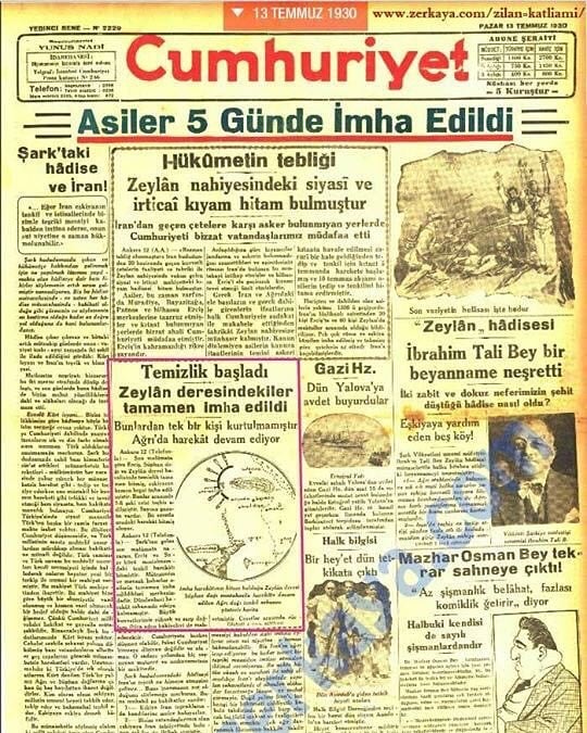 13 Temmuz 1930 günü, Türk Devleti’nin uçakları tarafından Zilan bölgesi bombalanır, dağlar ve dereler ateş altına alınır. Bölgenin giriş ve çıkışları tutulur ve bölge on binlerce asker tarafından kuşatılır, katliam başlar. Yeni doğmuş bebekten, 90'lık ihtiyara kadar her yaş ve cinsiyetten insan; mitralyöze tutularak, süngülenerek, buğday başağı biçilircesine yok edilir. Toplam 44 köy ateşe verilir ve yaklaşık 15 bin kişi vadide, birbirlerine bağlanarak toplu bir şekilde vahşice katledilir.